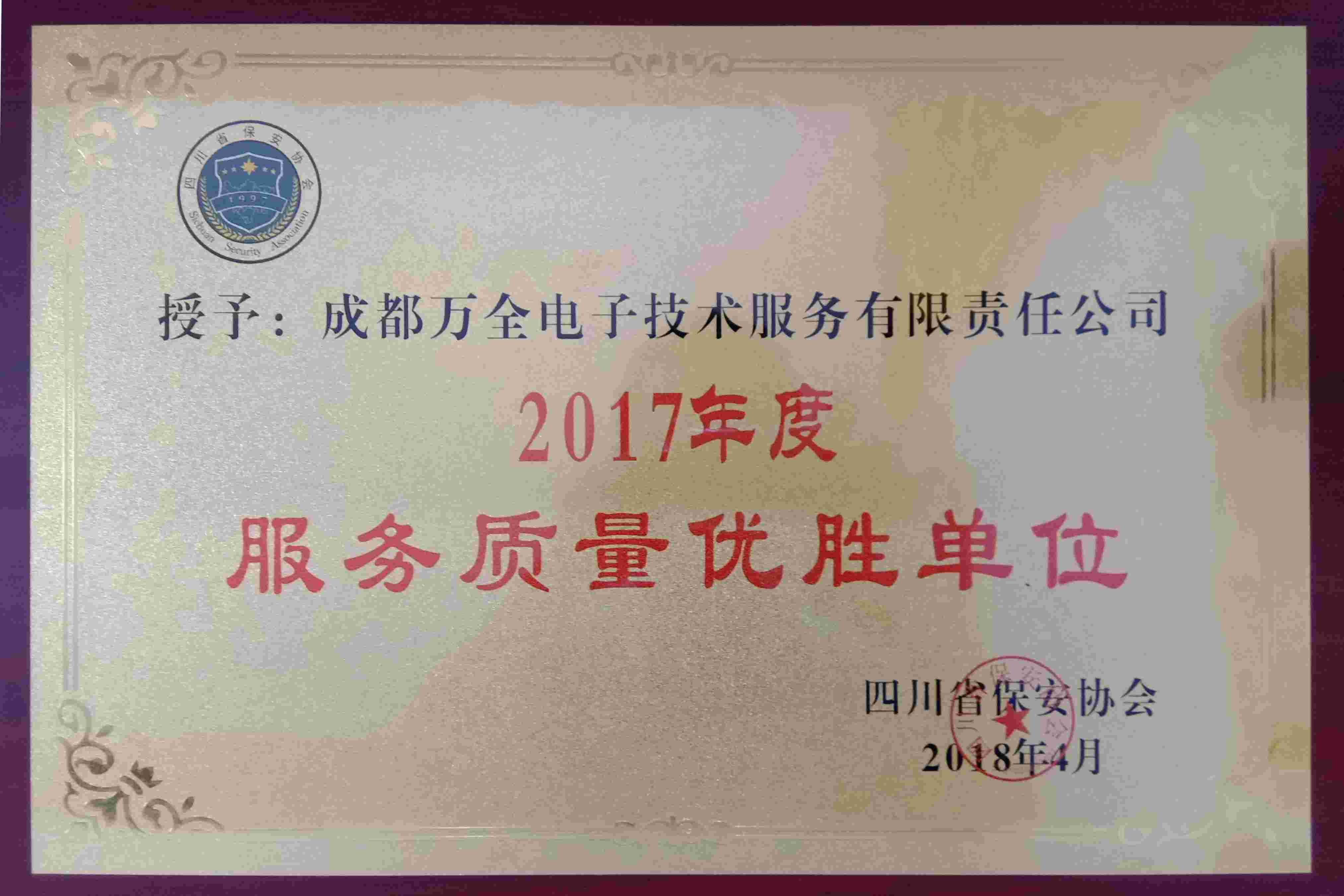 2017年4月四川省安保協(xié)會(huì)授予成都萬全電子“2017年度服務(wù)質(zhì)量?jī)?yōu)勝單位”稱號(hào)