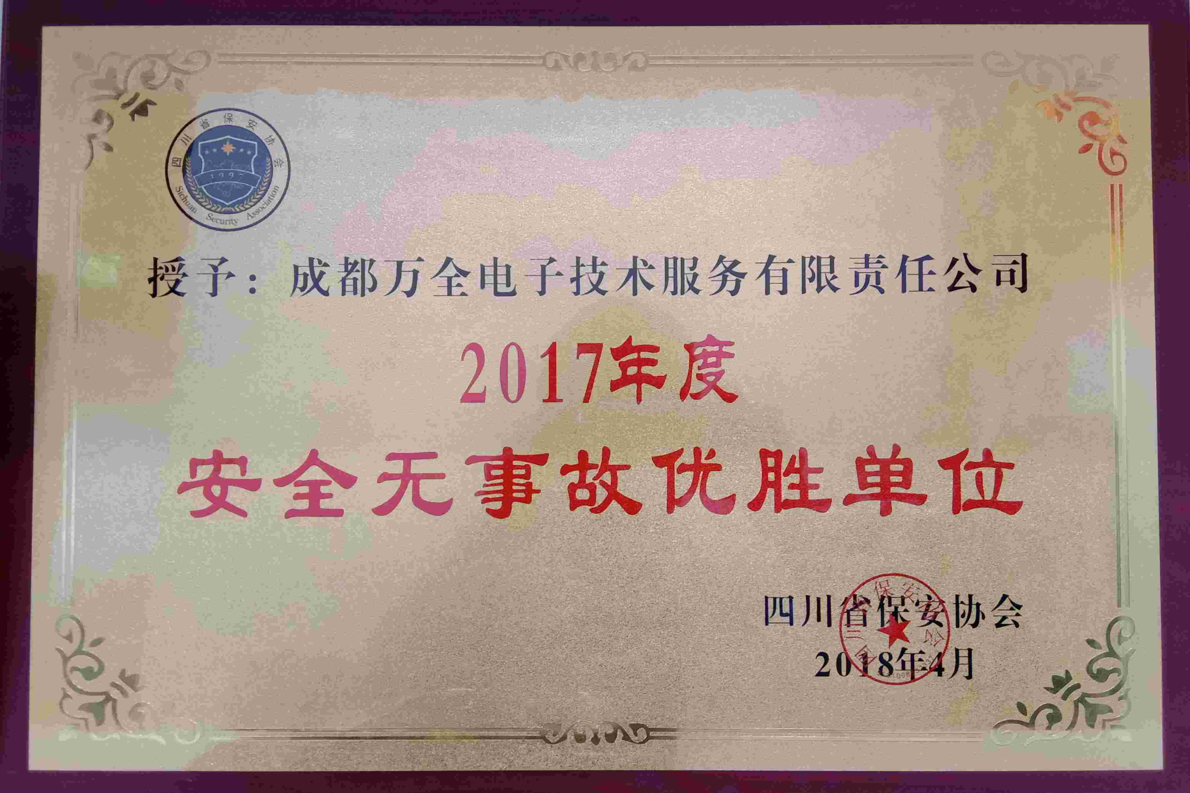 2017年4月四川省安保協(xié)會(huì)授予安防集成商成都萬全電子“2017年度安全無事故優(yōu)勝單位”稱號(hào)