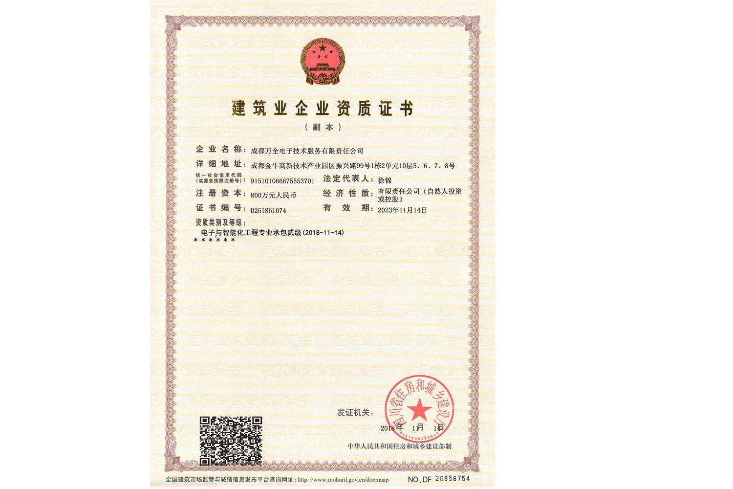 安防工程公司成都萬全電子取得建筑企業(yè)資質(zhì)